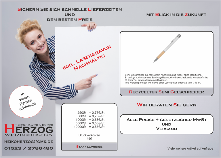 Entdecken Sie die unendlichen Möglichkeiten, die unsere hochwertigen Werbeartikel Ihrem Unternehmen bieten können. Bei Herzog Werbedesign sind wir stolz darauf, Ihnen eine umfangreiche Palette von Produkten anzubieten, die Ihre Marke hervorheben und Ihr Marketing vorantreiben werden.